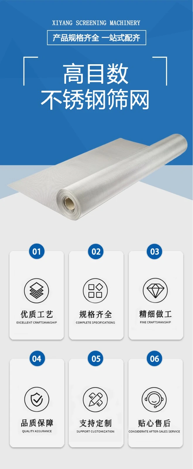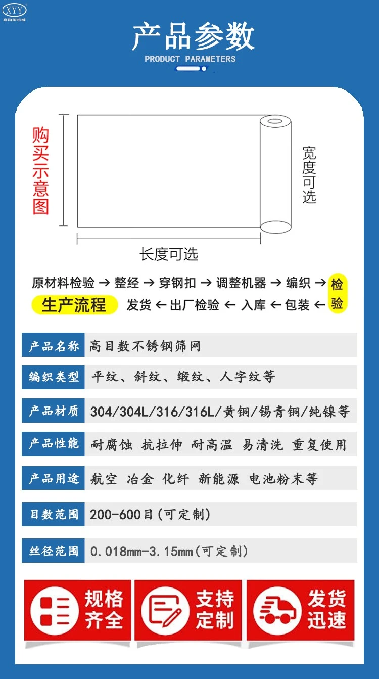 喜阳阳高目数不锈钢筛网采用精密的编织技术,如平纹编织或斜纹编织,确保网孔的均匀性和网面的平整度,减少网孔变形,提高使用寿命和过滤效率。